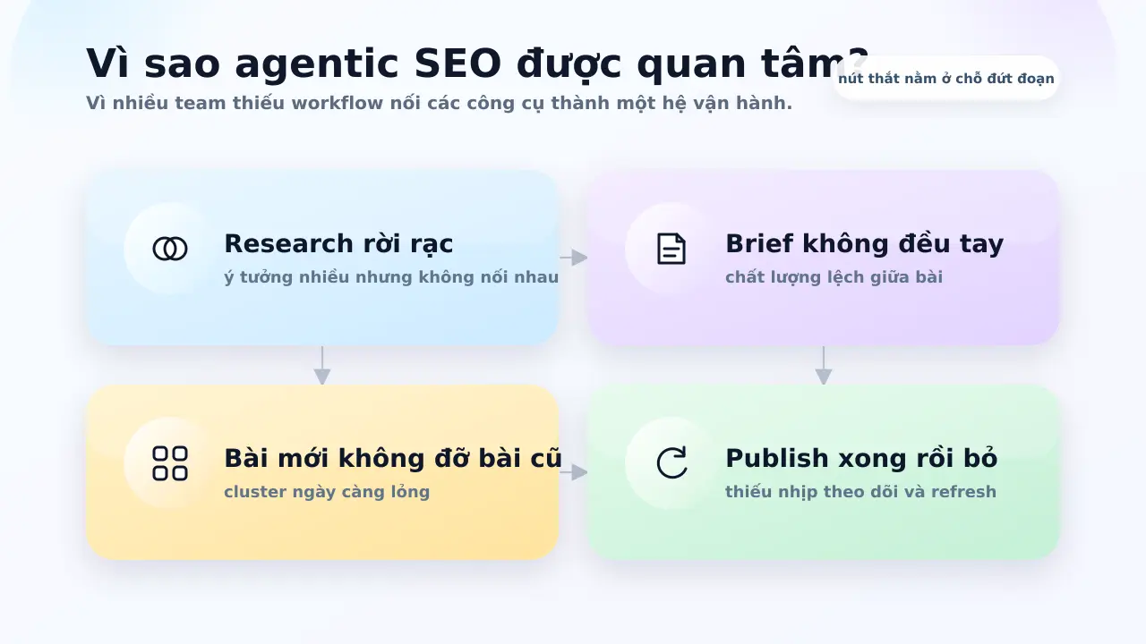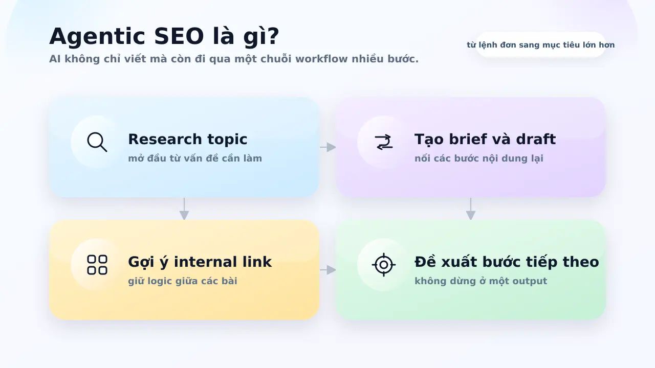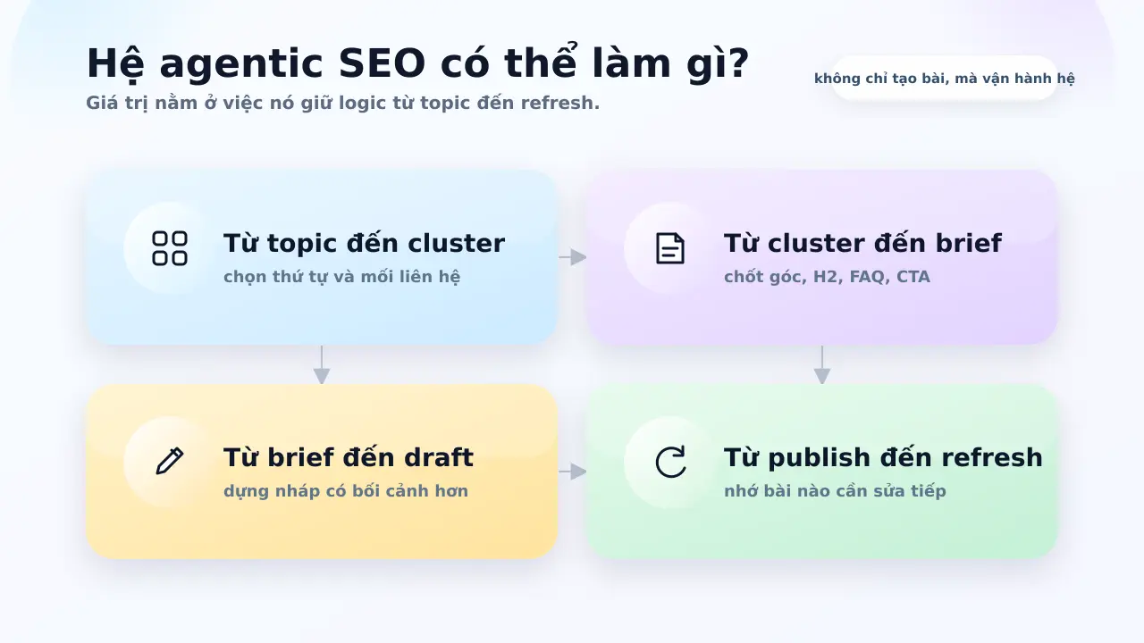 Một hệ thống agentic SEO có thể nối research, brief, draft, link và publish logic hơn.