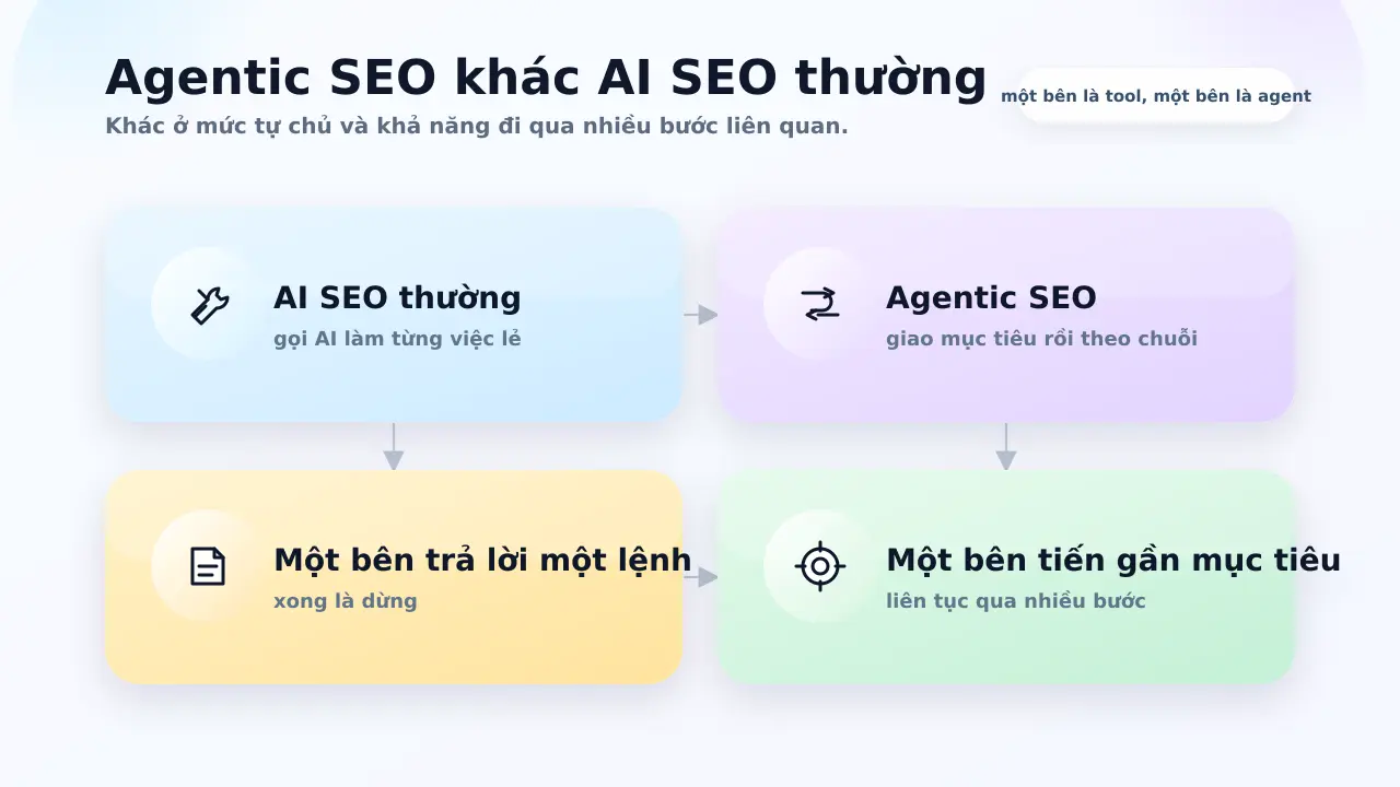 • Agentic SEO: con người giao mục tiêu, còn agent đi qua nhiều bước để hoàn thành mục tiêu đó