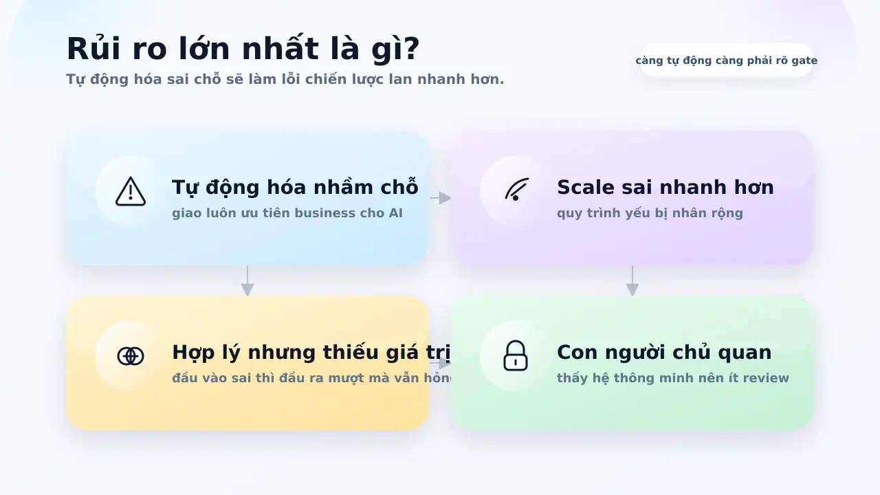 Không phải khâu nào cũng nên trao quyền nhiều cho agent. Nếu giao luôn phần chọn chiến lược, định vị và ưu tiên business cho AI, rủi ro lệch hướng là rất cao.