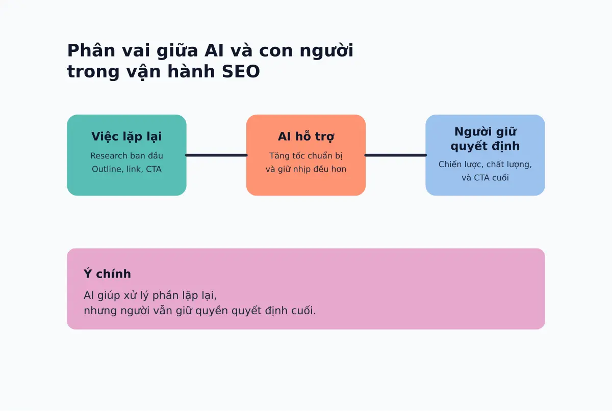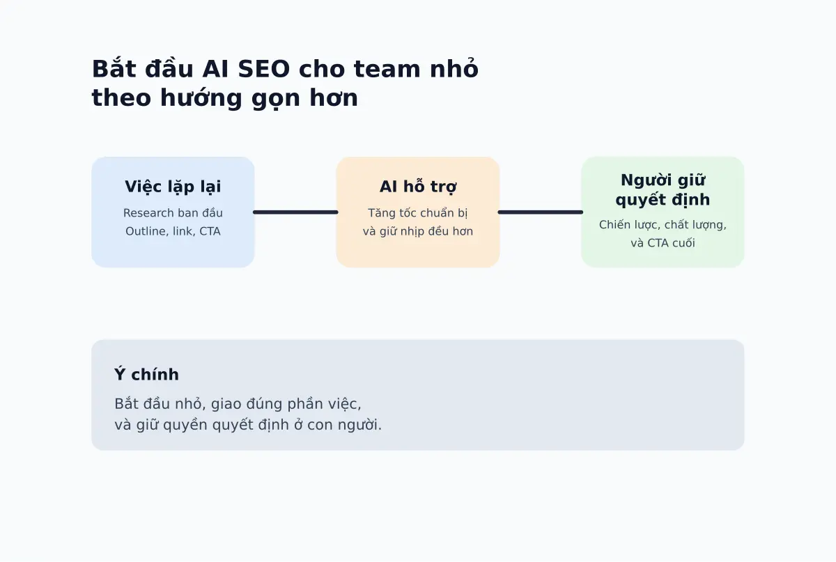 Bài viết này đi theo hướng đó: bắt đầu từ bài toán kinh doanh thật, chọn đúng phần việc để giao AI, và giữ con người ở phần quyết định. Mục tiêu là giúp team nhỏ hoặc doanh nghiệp đang muốn làm SEO đều hơn có một cách bắt đầu gọn, ít rủi ro, và không cần phình bộ máy quá sớm.