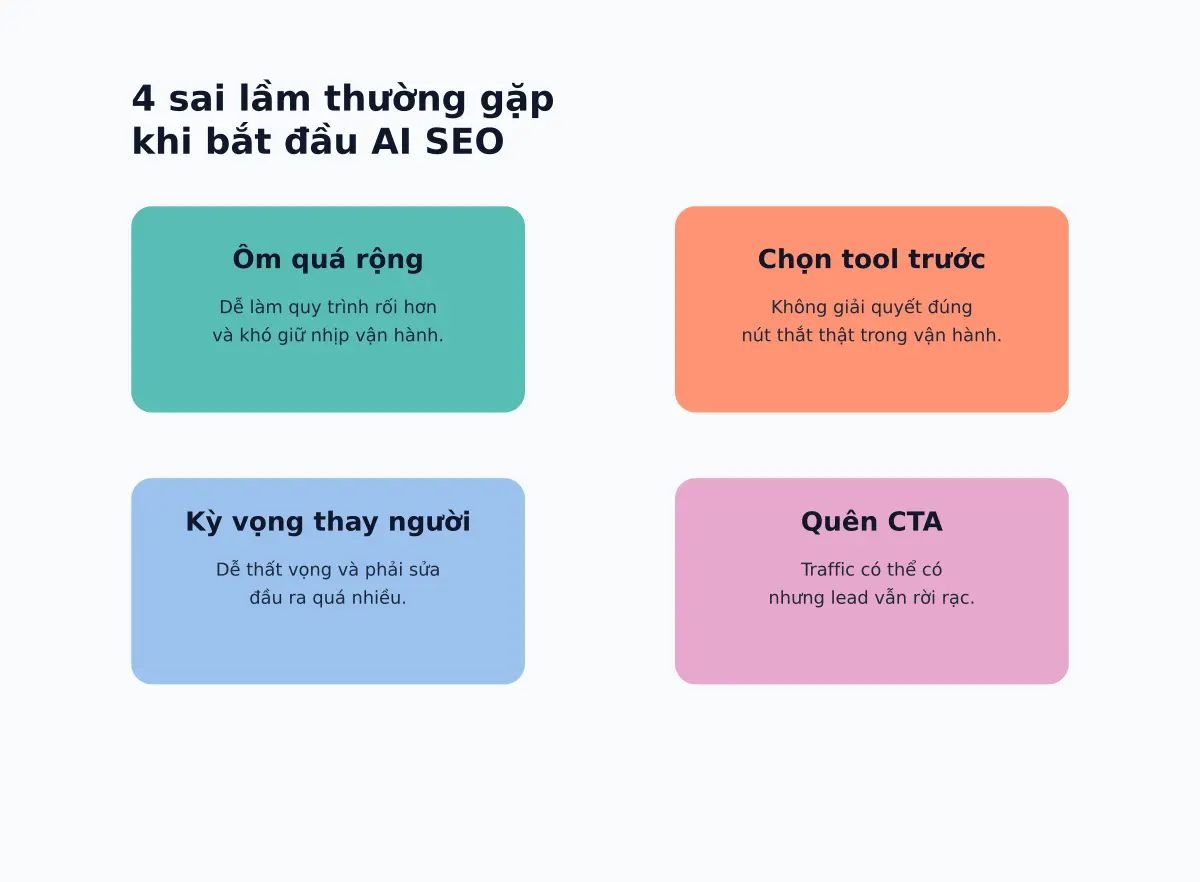 Sai lầm phổ biến là bắt đầu quá rộng. Nghe thấy AI có thể làm nhiều thứ, doanh nghiệp dễ muốn áp dụng vào toàn bộ quy trình SEO ngay. Kết quả thường là công cụ thì nhiều hơn, nhưng quy trình lại rối hơn. Người trong team phải kiểm tra nhiều hơn, chỉnh nhiều hơn, mà vẫn không rõ phần nào thật sự tạo giá trị.