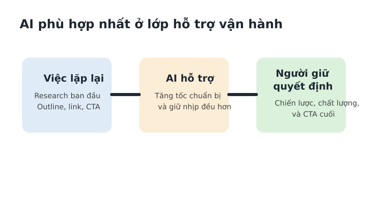 Đây là những phần dễ kiểm thử, dễ đo chất lượng, và ít rủi ro hơn so với việc giao cả chiến lược nội dung hoặc publish tự động.