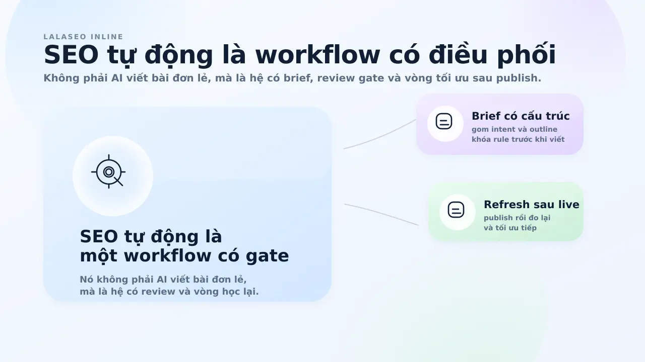 Hiểu đúng hơn, đó là cách thiết kế một workflow SEO để phần máy làm tốt được tự động hóa, còn phần quyết định chất lượng và hướng đi vẫn do con người giữ quyền kiểm soát.