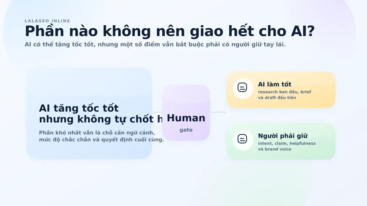Ít nhất là các phần sau: chọn topic ưu tiên, kiểm tra intent, duyệt claim quan trọng, tinh chỉnh giọng bài, và quyết định bài nào nên publish hoặc refresh.