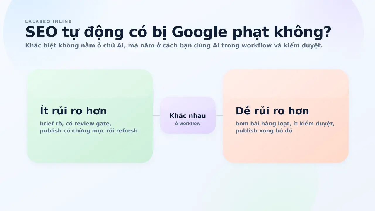 Đây là mối lo lớn nhất, và cũng là chỗ cần nói thẳng. Nếu bạn muốn đào sâu riêng phần này, hãy xem thêm bài SEO tự động có bị Google phạt không?.