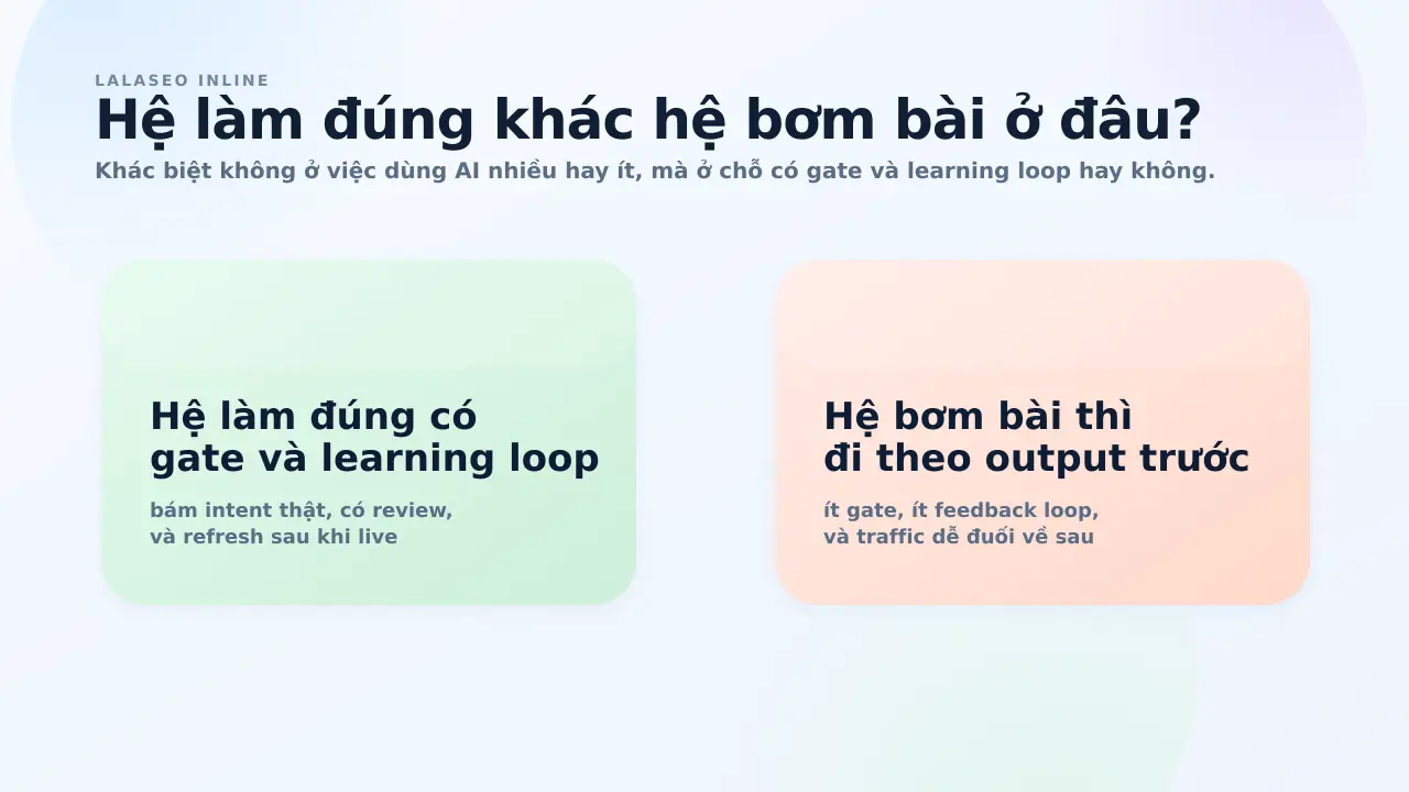 Khác biệt không nằm ở việc bạn ra bao nhiêu bài. Khác biệt nằm ở chỗ: bạn đang tự động hóa để tăng chất lượng hệ thống, hay chỉ đang tăng tốc sản xuất chữ.