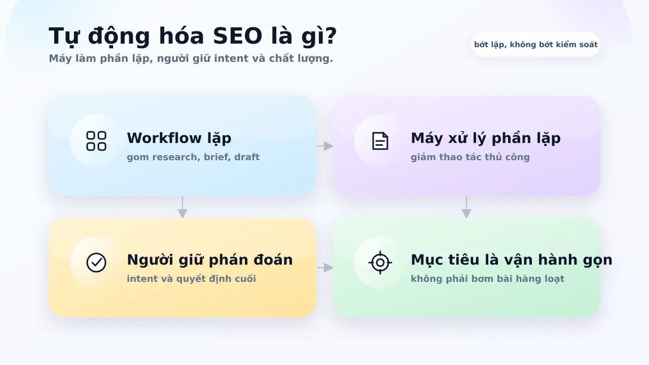 Hiểu đúng hơn, đó là cách tổ chức lại workflow SEO để máy xử lý phần lặp lại, còn con người giữ phần định hướng, đánh giá và kiểm soát chất lượng.
