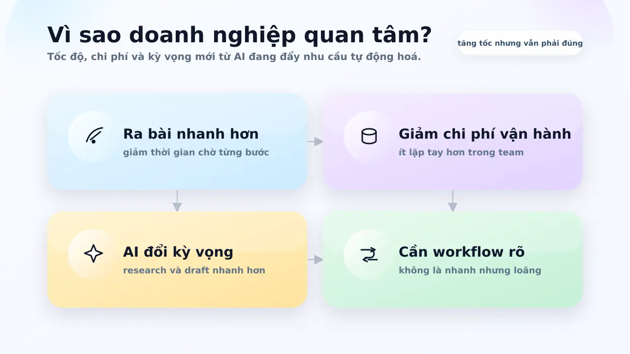 Lý do đầu tiên là tốc độ. Khi doanh nghiệp đã thấy SEO có thể mang lại traffic tốt, câu hỏi tiếp theo gần như luôn là: làm sao ra bài đều hơn mà không phải tăng đội ngũ quá nhanh?