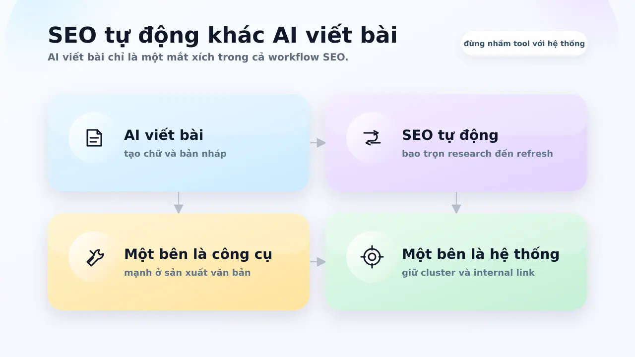 Không. AI viết bài chỉ là một phần. Tự động hóa SEO còn bao gồm research, brief, internal link, publish, refresh và theo dõi hiệu suất.