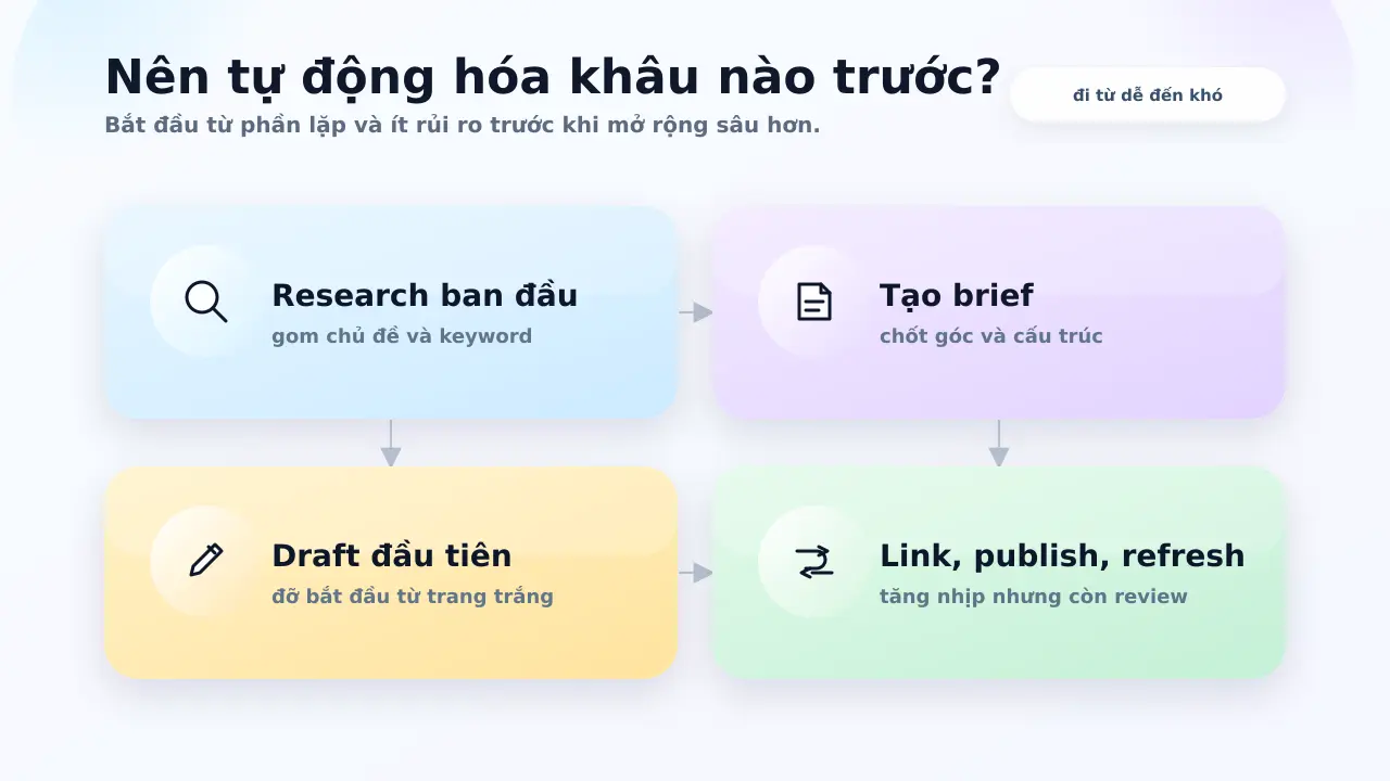 Ngược lại, nếu tự động hóa được dùng để tăng tốc research, hỗ trợ brief, phát hiện cơ hội refresh và giữ con người ở khâu kiểm soát chất lượng, thì đó vẫn là hướng đi hợp lý.
