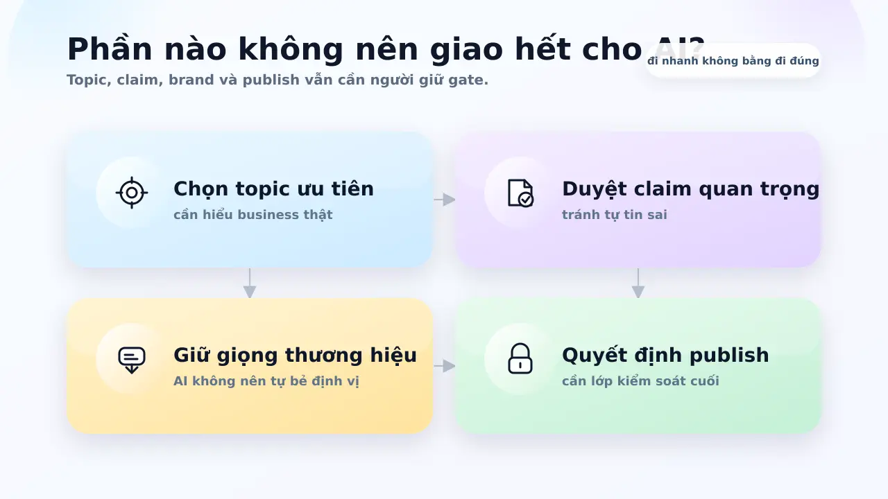 - giữ người thật ở bước biên tập, kiểm duyệt intent và quyết định publish